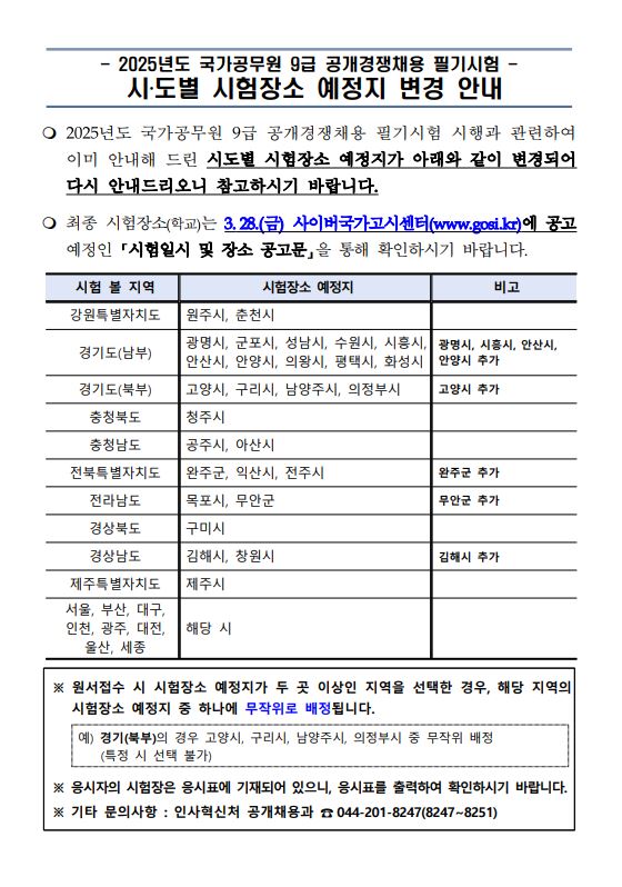▶ 2025년도 국가공무원 9급 공개경쟁채용 필기시험 시·도별 시험장소 예정지 변경 안내