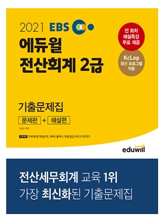 (2021 EBS 에듀윌 전산회계 2급 기출문제집)은 2021년 시험을 준비하는 수험생을 위해 문제와 해설, 백데이터를 2021년에 맞춰 수정하였습니다. 또한 현직 세무사의 전 회차 무료 해설특강과 각 문항과 연결되는 THEME별 핵심요약(특별부록)을 제공하여 학습에 어려움이 없도록 하였습니다.