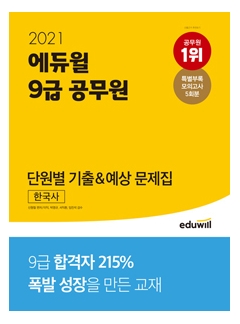(2021 에듀윌 9급 공무원 단원별 기출&예상 문제집 한국사)는 반드시 풀어 보아야 할 ‘필수기출 문제’와 기출 기반의 ‘출제예상 문제’를 단원별로 나누어 구성하였습니다. 단원별 문제풀이를 통해 기출회독 점검과 문제풀이 훈련은 물론, 약점 영역까지 파악하여 학습의 빈틈을 완벽하게 메울 수 있습니다. 자신의 취약점을 모른 채 무작정 학습 커리큘럼만 따라가는 수험생들에게 합격으로 빨리 가는 길을 안내해 드립니다.