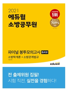 (2021 에듀윌 소방공무원 파이널 봉투모의고사 소방학개론+소방관계법규)는 소방공무원 시험 전 출제위원이 집필하여 시험 직전 실전을 경험할 수 있는 교재입니다. 실제 시험지 크기와 구성을 그대로 구현하여 실제 시험에 응시하는 것 같이 문제를 풀어볼 수 있으며, 선택과목을 한 권으로 묶어 시간 안배 훈련까지 가능한 최고의 가성비 교재입니다. 또한 전 문항 핵심 포인트와 상세해설을 수록하였고, 1초 합격예측! 모바일 성적분석서비스를 통해 OMR 자동채점 및 모바일 성적분석표를 즉시 발급받을 수 있습니다. 모바일 성적분석표를 통해 응시생들과의 성적 비교가 가능하므로, 시험 직전 자신의 위치를 객관적으로 파악할 수 있습니다.