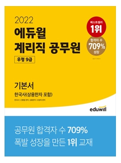 (2022 에듀윌 우정 9급 계리직 공무원 기본서 한국사(상용한자 포함))는 계리직 한국사에 최적화된 내용으로 구성하였다. 2021년 3월 20일 시행된 최신 기출문제를 수록하여 최신 출제경향을 파악할 수 있으며, 개편되는 계리직 시험 과목을 전면 반영하여 구성하였다.