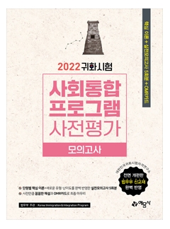 대한민국 국적 취득에 필수인 사회통합프로그램의 첫 시작을 위한 ‘2022 귀화시험 사회통합프로그램 사전평가 모의고사’ 개정판이 출간되었습니다. 본 도서는 2021년 새롭게 발간된 법무부 신교재의 최신 개정 사항을 가장 정확하게 반영하였습니다. 사전평가 모의고사 문제집으로서, 사전평가에서 고득점을 받아 높은 단계에 배치받을 수 있도록 도와드립니다.