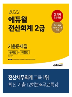 (2022 에듀윌 전산회계 2급 기출문제집)은 2022년 시험을 준비하는 수험생을 위해 문제와 해설, 백데이터를 2022년에 맞춰 수정하였다. 또한 현직 세무사의 전 회차 무료 해설특강과 각 문항과 연결되는 테마별 핵심요약(특별부록)을 제공하여 학습에 어려움이 없도록 하였다.