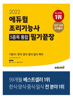 (2022 에듀윌 조리기능사 5종목 통합 필기끝장)은 조리기능사 필기 출제기준을 반영하고 NCS학습모듈에 맞춘 교재이다. 공통편+종목편 구성으로 한권으로 한식/양식/중식/일식/복어 5종목을 모두 준비할 수 있다.