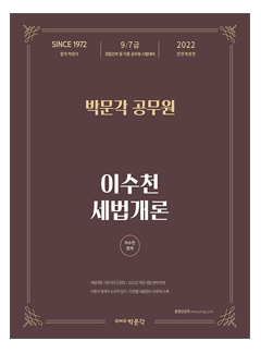 본문은 세법 조문을 바탕으로 수험생들이 법령을 이해하는 데 도움이 되는 문장으로 재구성하였고 날개의 주석 등으로 확실히 짚고 넘어가야 할 부분을 재확인시켜 준다. 『2022 이수천 세법개론』으로 반복 학습한다면 합격에 필요한 고득점을 얻는 데 큰 도움이 될 것이라 확신한다.