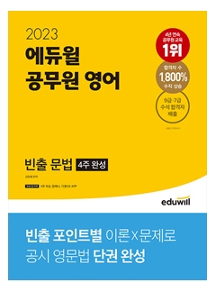 [2023 에듀윌 공무원 영어 빈출 문법(4주 완성)]은 공시 영문법의 기출 데이터를 완벽 분석하여 진짜 나오는 실전용 문법만 담았습니다. 빈출 출제포인트를 189개로 정리하여, 출제포인트별로 문풀전략, 바로 확인 문제, 기출 문장 OX 문제를 제공합니다. 실제로 출제된 내용은 ‘기출 DATA TIP’으로 기재되어 있습니다. 또한 문법 전용 모의고사인 G-Half 모의고사 10회분을 추가 제공하며, 모든 문제의 해설은 연계되는 189개 출제포인트 번호를 기재하여, 필요 시 바로 개념 학습이 가능하도록 구성하였습니다.