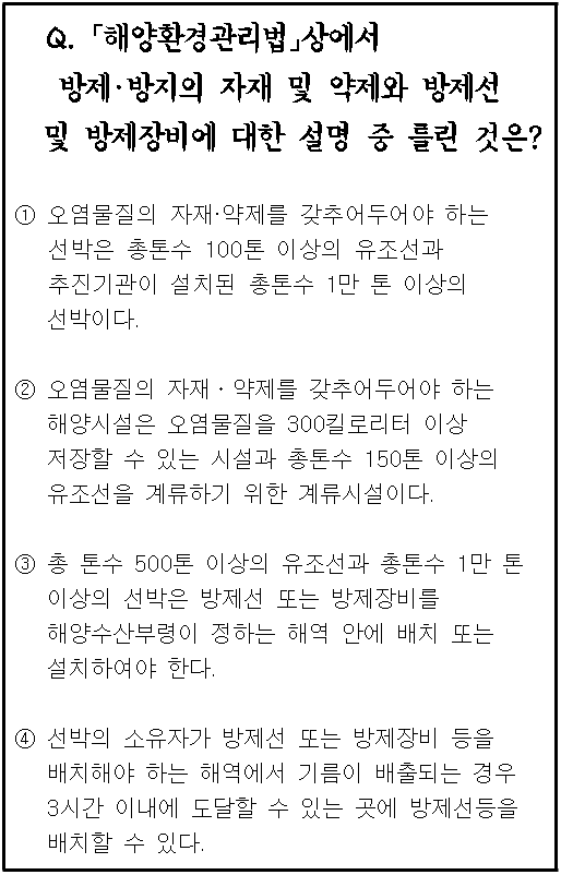 ► 오염물질의 자재ㆍ약제를 갖추어두어야 하는 해양시설은 오염물질을 300킬로리터 이상 저장할 수 있는 시설과 총톤수 100톤 이상의 유조선을 계류하기 위한 계류시설이다.