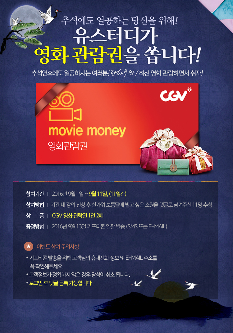 [추석맞이 이벤트] 유스터디가 영화관람권을 쏩니다!!!(9/1~9/11)조회수 : 3,069