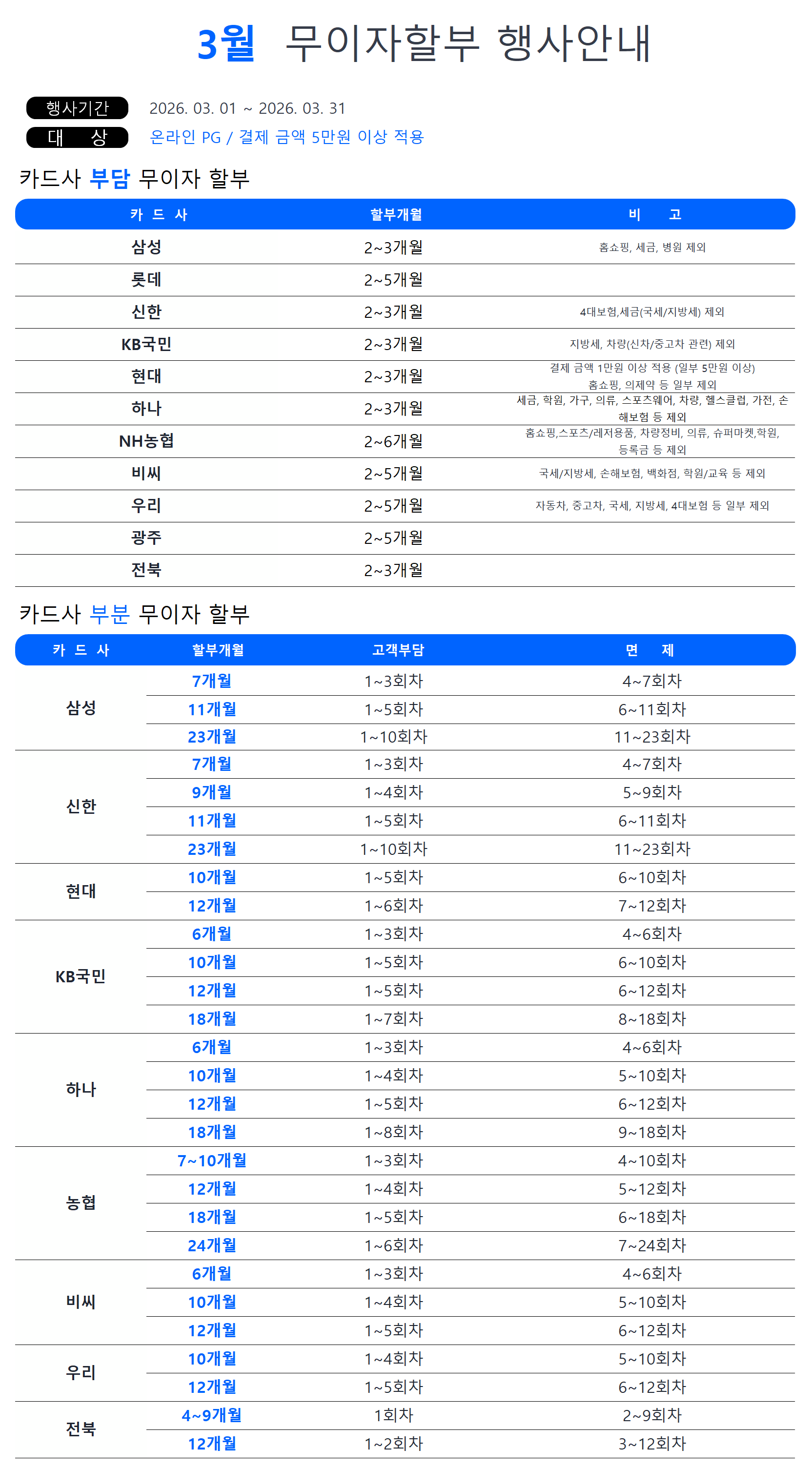 [이벤트]2026년 3월 카드 무이자 할부 행사 안내