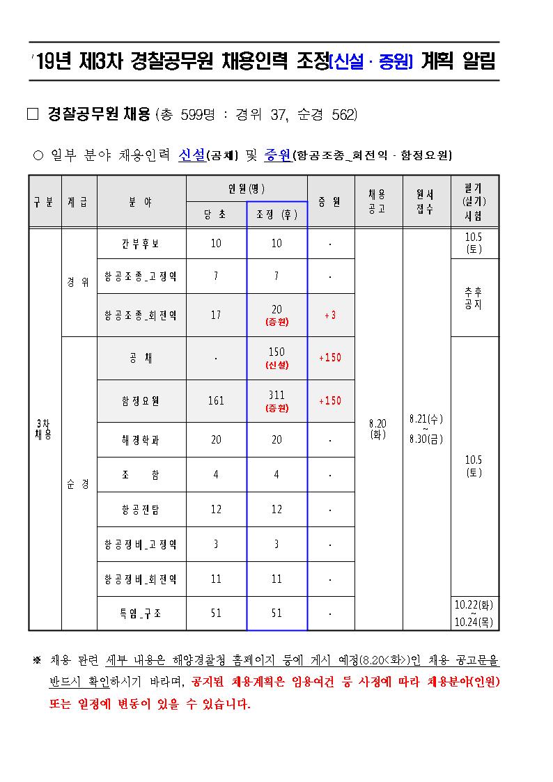 ▶ 2019년 제3차 해양경찰공무원 채용인력 조정 (신설 및 증원) 계획 알림조회수 : 2,631