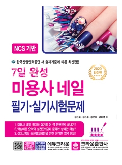 『7일완성 미용사 네일 필기ㆍ실기시험문제』는 다년간의 현장경험과 교육경험, 그리고 네일 관련 시험 감독위원 경험을 바탕으로 좀 더 쉽게 자격증을 취득할 수 있도록 집필되었다. 필기와 실기를 얇은 한권에 정리함으로써 수험생들에게 좀 더 쉽게 시험에 접근할 수 있게 하였고, 더욱 효과적인 수험준비가 가능하게 하였다. 도서는 최근 기출문제 분석과 출제경향에 맞춘 모의고사와 실기 예제를 함께 수록하였다.