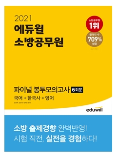 (2021 에듀윌 소방공무원 파이널 봉투모의고사 국어+한국사+영어)는 소방 출제경향을 완벽하게 반영하여 시험 직전 실전을 경험할 수 있는 교재입니다. 실제 시험지 크기와 구성을 그대로 구현하여 실제 시험에 응시하는 것 같이 문제를 풀어볼 수 있으며, 필수과목을 한 권으로 묶어 시간안배 훈련까지 가능한 최고의 가성비 교재입니다. 또한 전 문항 핵심 포인트와 상세해설을 수록하였고, 1초 합격예측! 모바일 성적분석서비스를 통해 OMR 자동채점 및 모바일 성적분석표를 즉시 발급받을 수 있습니다. 모바일 성적분석표를 통해 응시생들과의 성적 비교가 가능하므로, 시험직전 자신의 위치를 객관적으로 파악할 수 있습니다.
