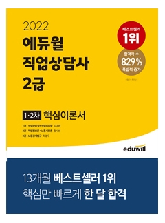 (2022 에듀윌 직업상담사 2급 1,2차 핵심이론서)는 수험생들이 단기간에 ‘합격’이라는 결과를 얻을 수 있도록, 수년간의 기출문제 분석을 토대로 1차 시험과 2차 시험 모두 효율적으로 대비할 수 있는 최적의 교재입니다.