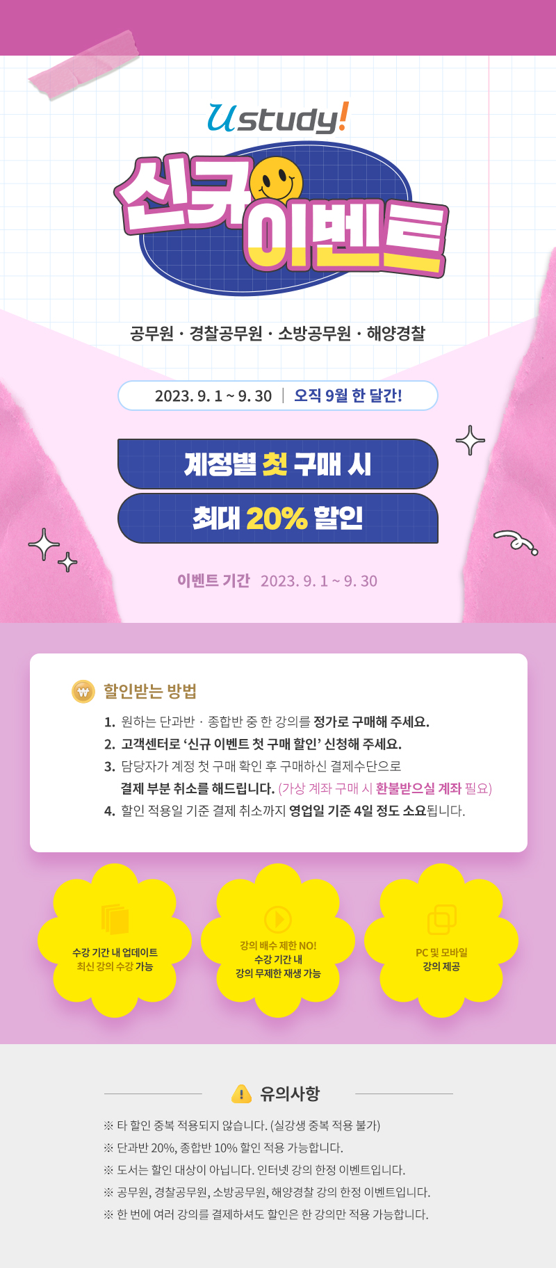 신규 첫 구매 이벤트! 유스터디강의 최대 20퍼센트 할인 (9/1~9/30)