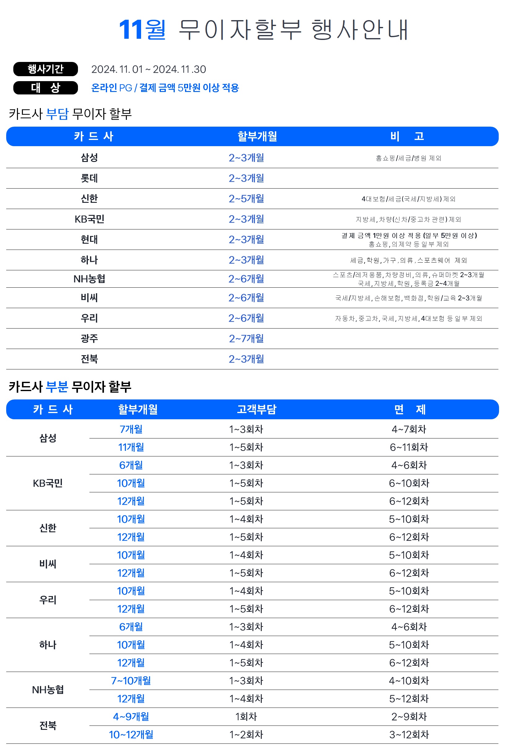 [이벤트]2024년 11월 카드 무이자 할부 행사 안내