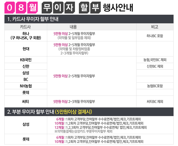 2016년 8월 다음과 같이 신용카드 무이자 할부 행사를 시행하오니 많은 관심과 참여 부탁드립니다.