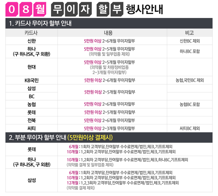 [이벤트]8월 카드 무이자 할부 행사 안내