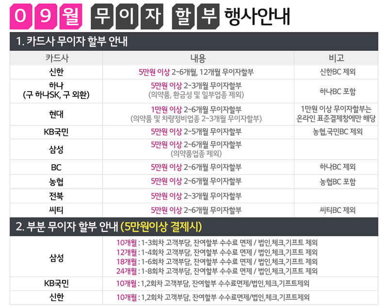 [이벤트]2019년9월 카드 무이자 할부 행사 안내