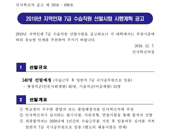▶ 2019 인사혁신처 지역인재 7급 수습직원 선발시험 시행 공고조회수 : 138