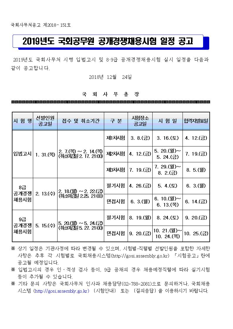 ▶ 2019 국회사무처 공무원 공개경쟁채용시험 일정공고