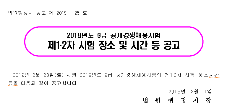 ▶ 2019 법원행정처 9급 공개경쟁채용시험 제1·2차 시험 장소 및 시간 등 공고조회수 : 110