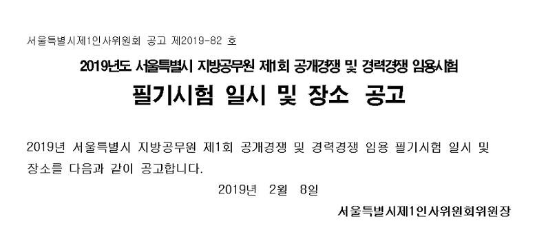 ▶ 2019 제1회 서울시 지방공무원 공개경쟁 및 경력경쟁 임용시험 필기시험 일시 및 장소 공고조회수 : 222