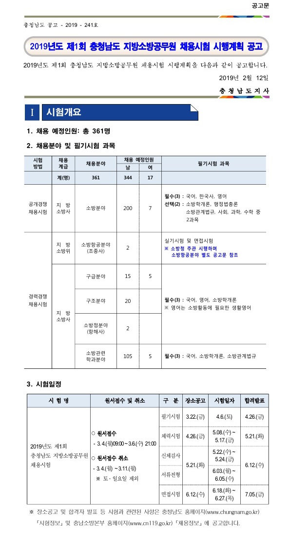 ▶ 2019 제1회 충남 지방소방공무원 채용시험 시행계획 공고조회수 : 88