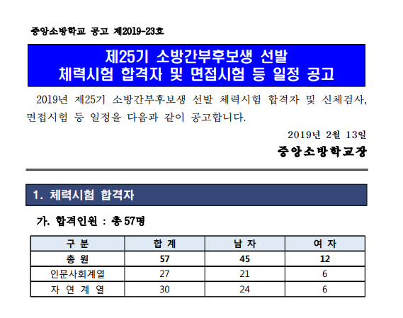 ▶ 2019 제25기 소방간부후보생 선발 체력시험 합격자 및 면접시험 등 일정 공고조회수 : 99