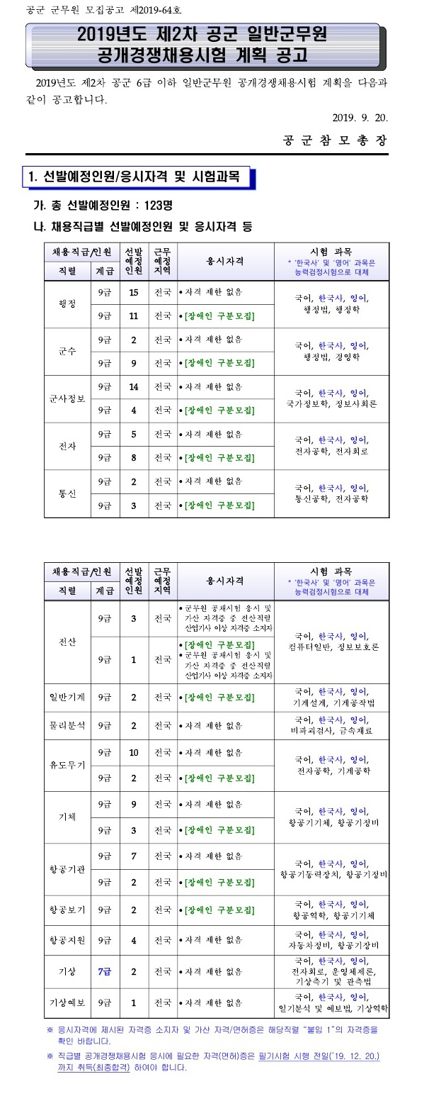 ▶ 2019 제2차 ★공군 일반군무원 공개경쟁채용시험 계획 공고