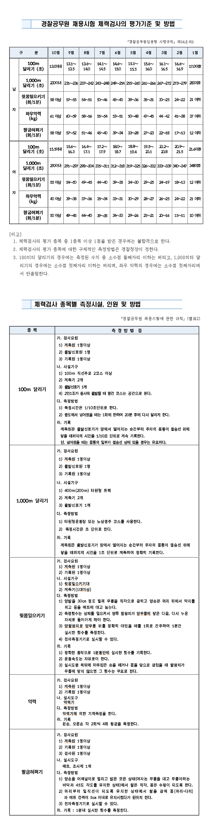 ▶ 경찰공무원 체력검사 평가기준 ◀