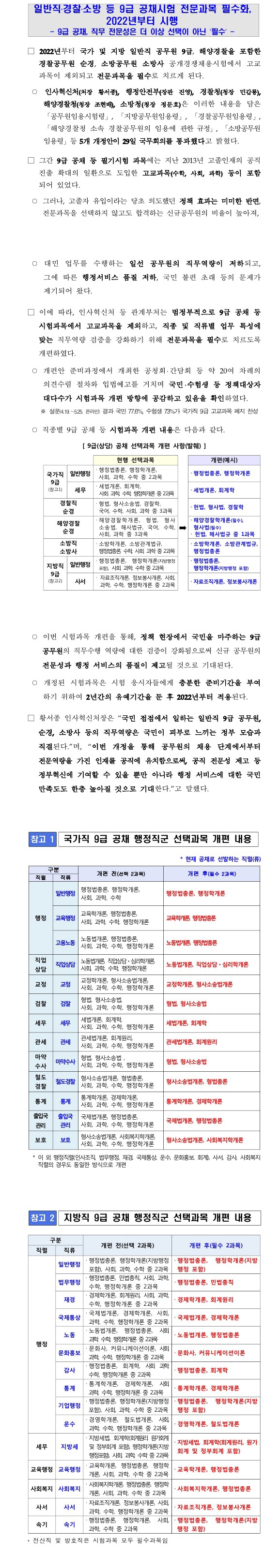 ★ 일반직 / 경찰 / 소방 등 9급 공채시험 전문과목 필수화, 2022년부터 시행