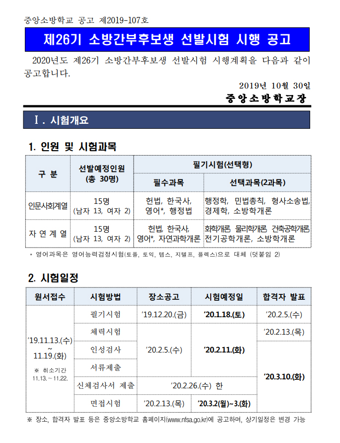 ▶ 2020년 제26기 소방간부후보생 선발시험 시행 공고