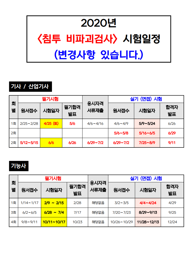 2020 침투 비파괴검사 시험일정 (필기 / 실기) ※일정수정