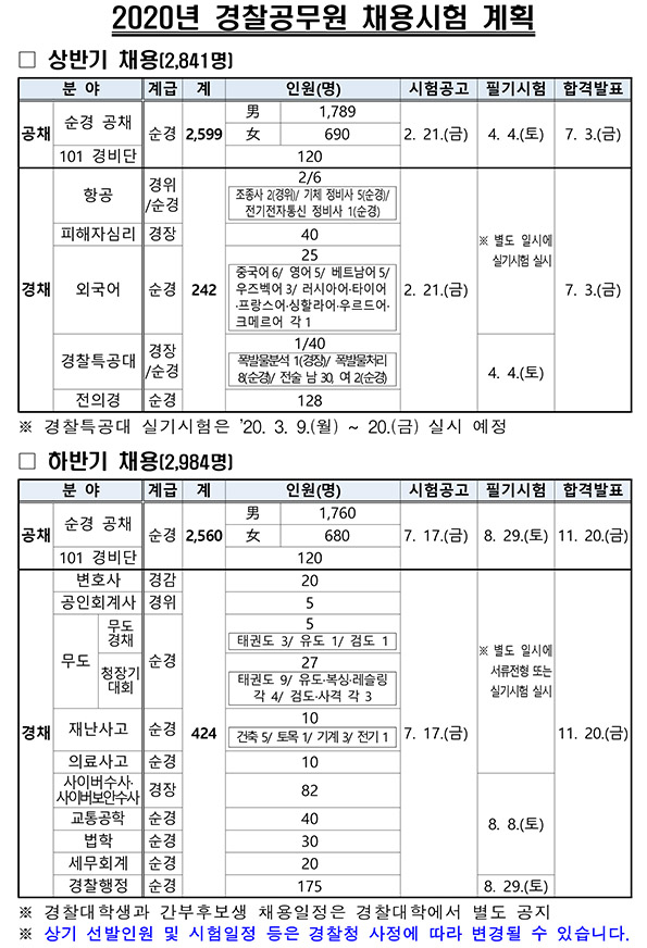 ★ 2020 경찰청 경찰공무원 채용시험 계획 (하반기 일정 수정)