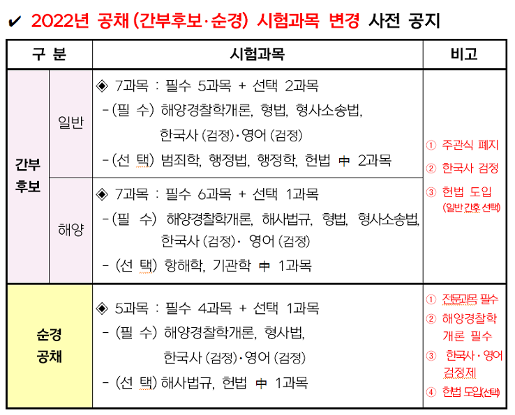 ※ 2022년 해양경찰 순경, 간부후보 시험과목 변경 사전공지