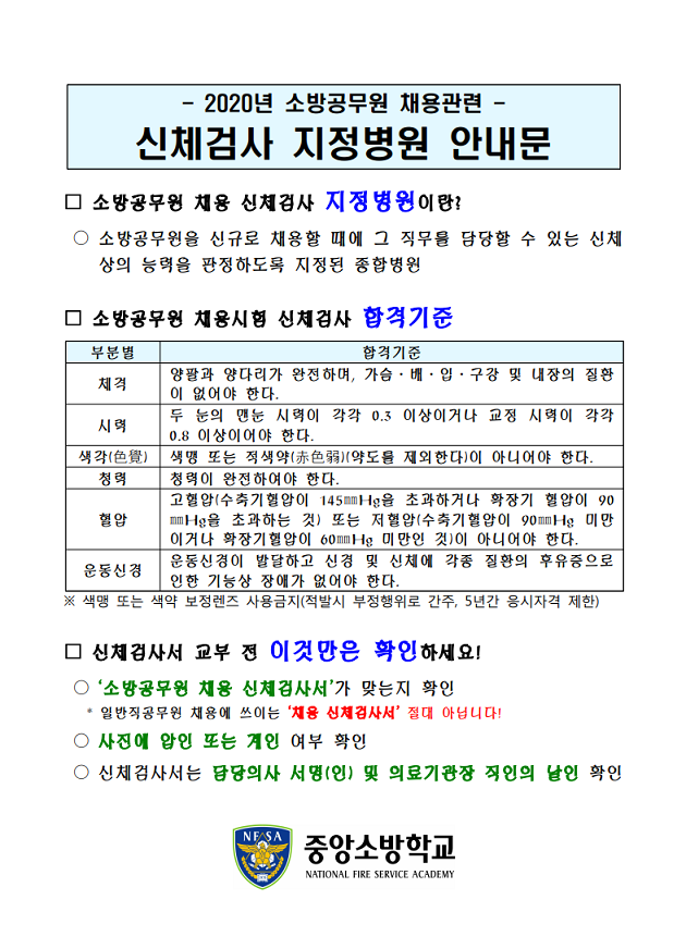 ※ 2020년도 소방공무원 채용 신체검사 지정 종합변원 안내 공고