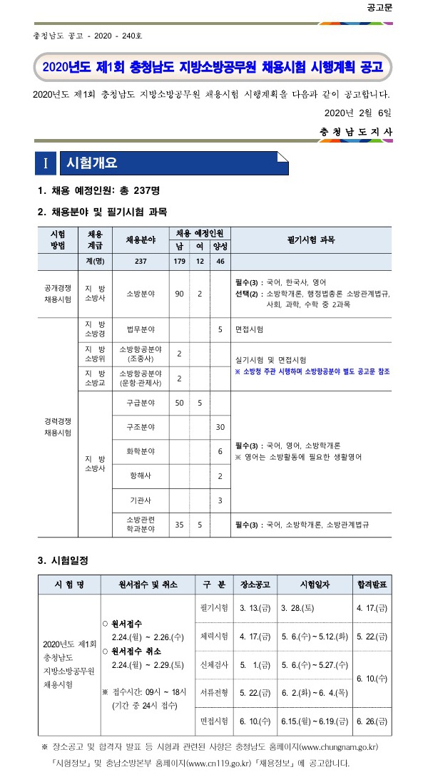 ▶ 2020 제1회 충남 지방소방공무원 채용시험 시행계획 공고