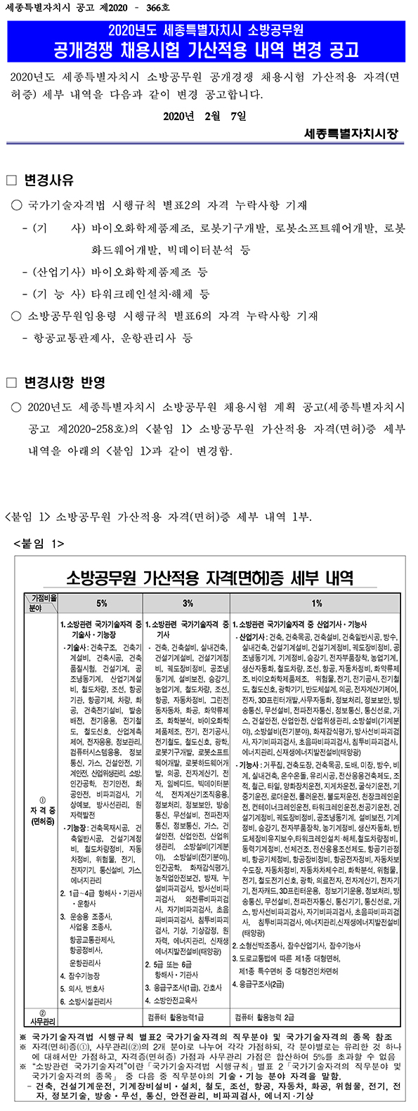 ※ 2020 세종시 소방공무원 공개경쟁 채용시험 가산적용 내역 변경 공고