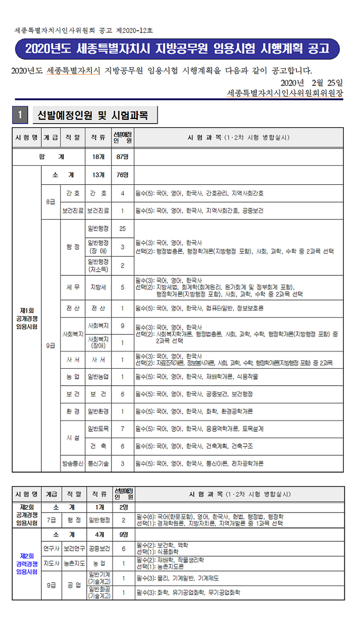 ▶ 2020 세종시 지방공무원 임용시험 시행계획 공고