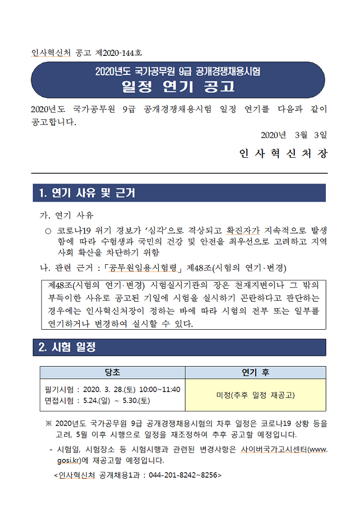 ★ 2020년도 국가공무원 9급 공개경쟁채용시험 일정 연기 공고 ★