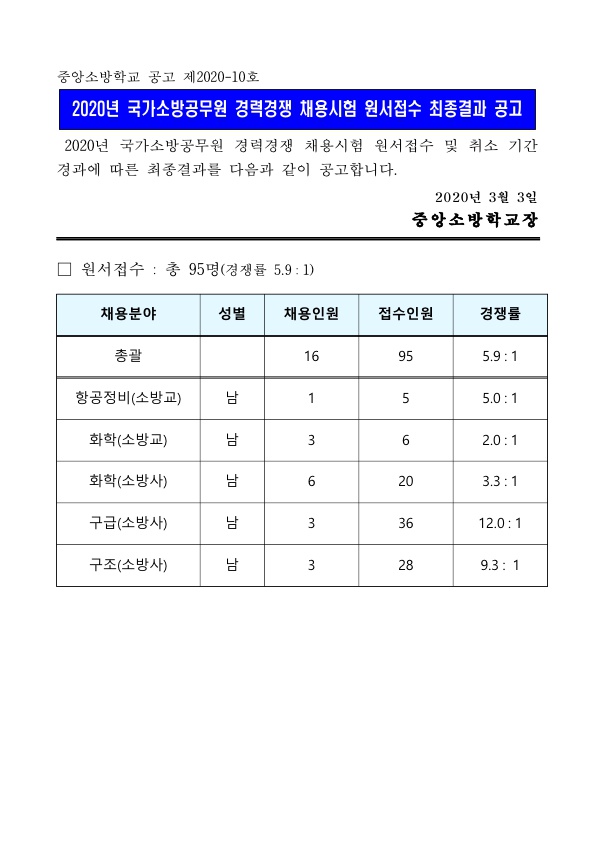 ▶ 2020 중앙소방학교 국가소방공무원 경력경쟁 채용시험 경쟁률