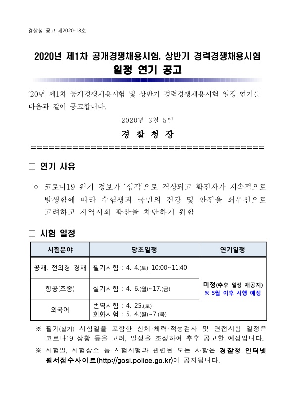 ★ 2020 경찰청 경찰공무원 제1차 공채, 상반기 경채시험 일정 연기 공고 ★