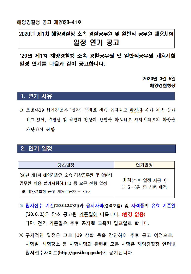 ★ 2020년 제 1차 해양경찰 공무원 채용시험 일정 연기 공고 ★