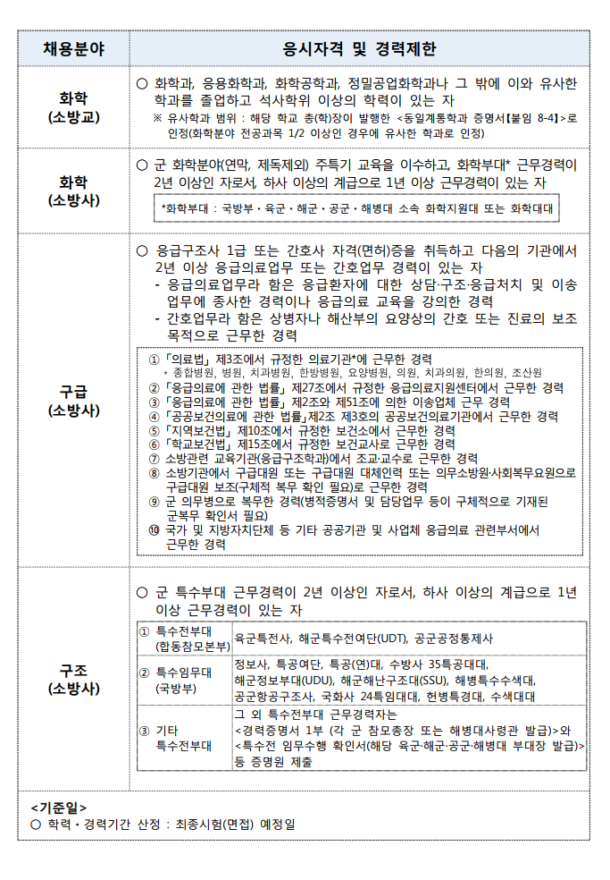 ※ 소방특채 경력 (소방교, 소방사) 응시자격 및 경력제한 (2020년 기준)