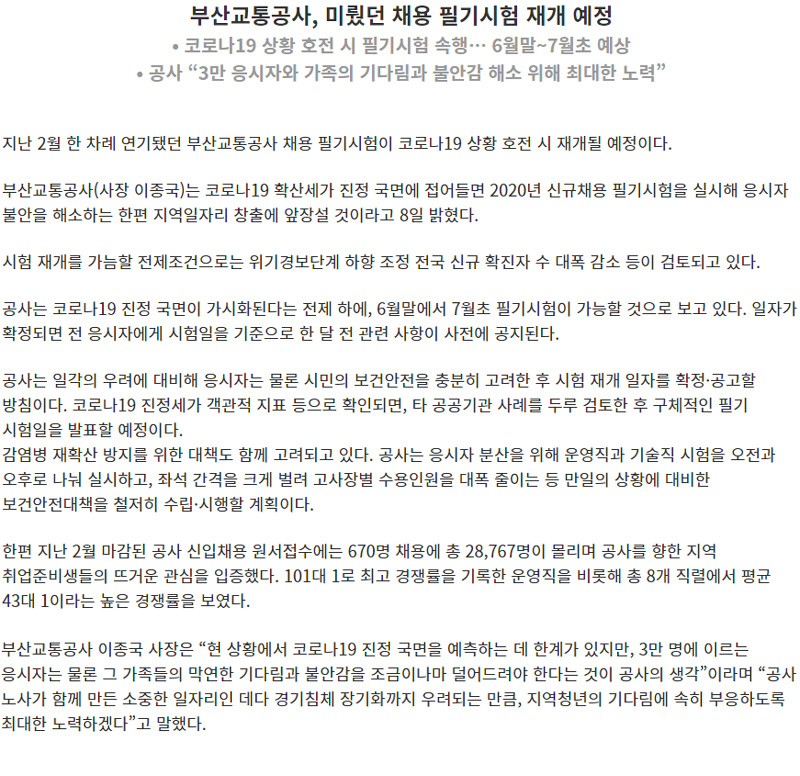 [보도자료] 부산교통공사, 미뤘던 채용 필기시험 재개 예정