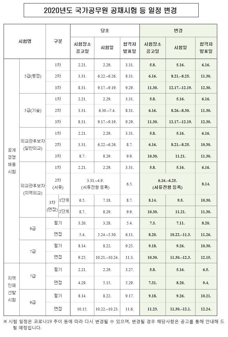 ★★ 2020년도 국가공무원 공채시험 등 일정 변경 ★★