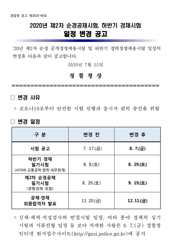 ★ 2020 경찰청 제2차 순경 공채시험, 하반기 경채시험 일정 변경 공고