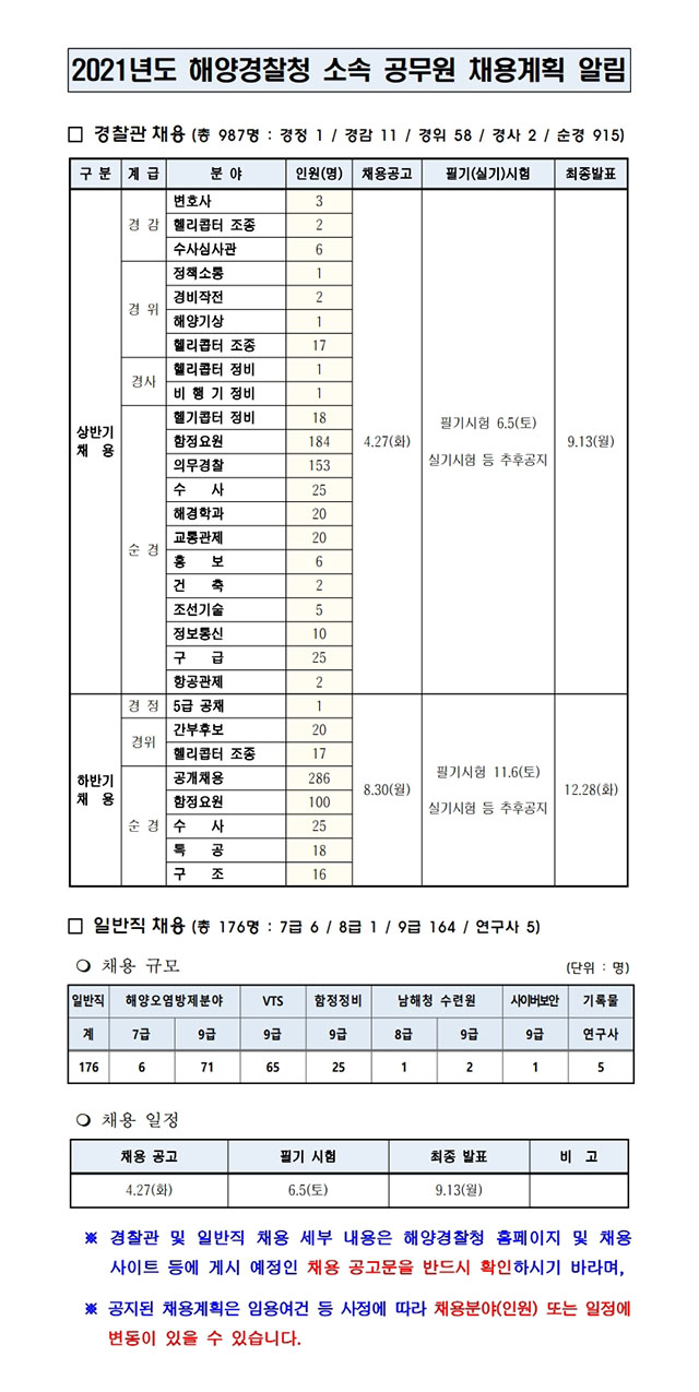 ▶ 2021년 해양경찰청 소속 공무원 채용계획 알림