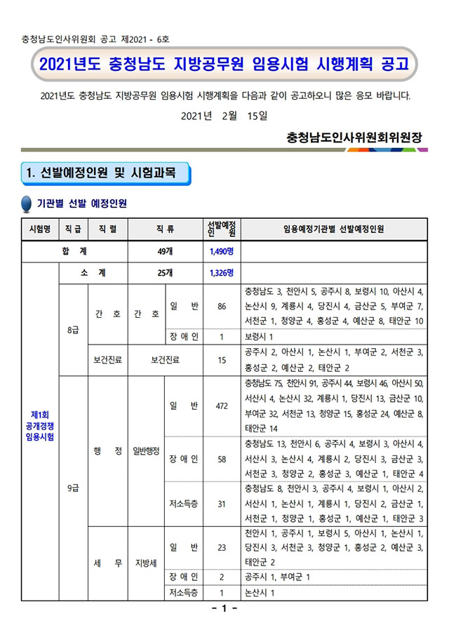 ▶ 2021년도 충청남도 지방공무원 임용시험 시행계획 공고
