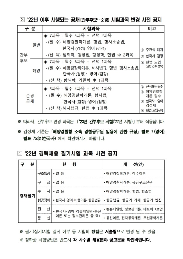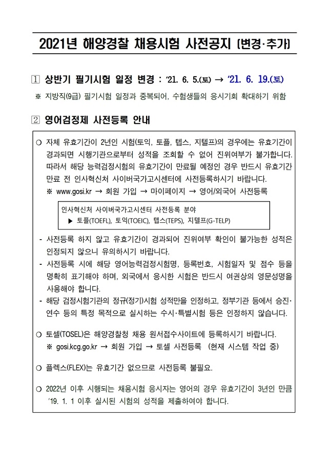 ▶ 2021년 해양경찰 상반기 채용시험 일정변경 등 사전공지